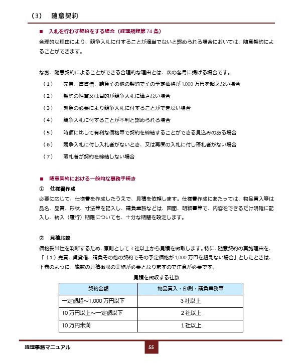>この経理事務マニュアルP55には、見積を徴収する社数の表が掲載されています。